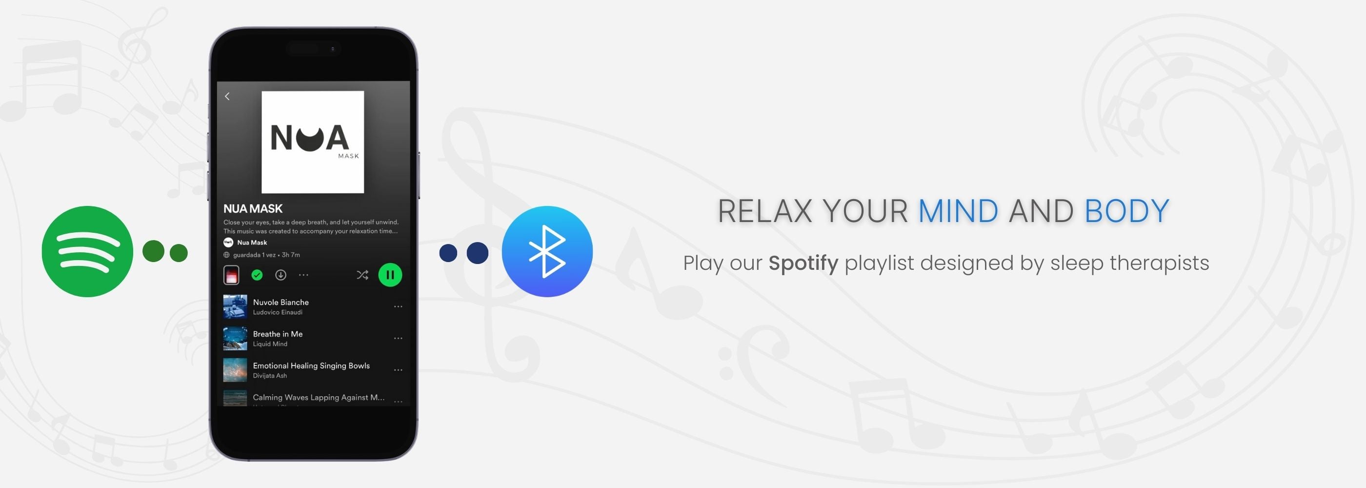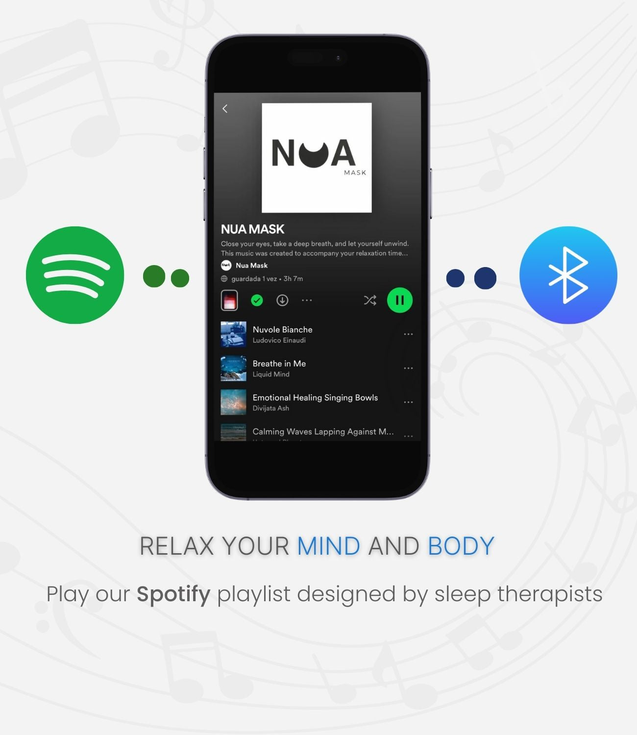 Yes, of course, you can use your own playlist or the one we recommend, Nua Mask. The link is on the website. The selection of these songs is also selected by a certified sleep physician.